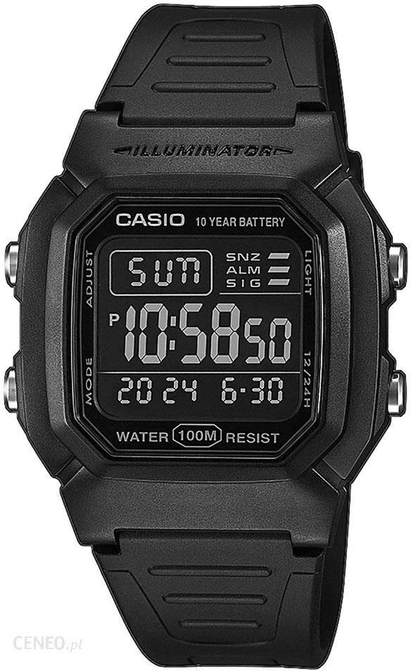 Casio Sport W-800H-1BVES to sportowy zegarek, który wyposażono w bardzo przydatne funkcje takie jak np. druga strefa czasowa, stoper, datownik, budzik z funkcją drzemki i podświetlenie. Charakterystyczną cechą tego modelu jest to, że może działać do 10 lat na jednej baterii bez wymiany. Wodoszczelność klasy 100M oznacza, że model ten może być naszym nieodłącznym wyposażeniem przy uprawianiu sportów wodnych takich jak pływanie i nurkowanie bez akwalungu. Przeznaczony jest dla osób aktywnych i lubiących sport.