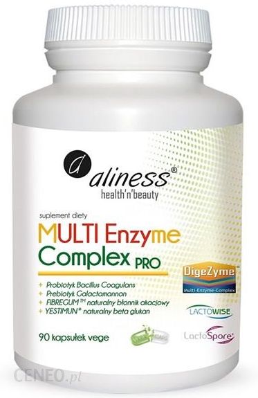 MULTI Enzyme Complex PRO _________________________________Kompleks roślinnych enzymów trawiennychsuplement diety- 90 kapsułek VEGEMulti Enzymy roślinne trawienne NON GMO. Polecane również dla wegan i wegetarian.AmylazaProteazaCelulazaLaktazaLipazaBetaglukanPapainabromelainaFibregum TMLactowise®Lactospore®_________________________________________________________________________________________Składniki zawarte w MULTI Enzyme complex PRO:DigeZyme® to innowacyjny wieloenzymatyczny kompleks DigeZyme®. Składa się z wolnych od GMO enzymów o szerokim spektrum działania, w tym amylazy, proteazy i lipazy, pozyskanych w procesie fermentacji Aspergillus oryze. Enzymy te rozkładają węglowodany, białka, tłuszcze i wszystkie trzy są odporne na działanie soków żołądkowych zachowując swoją aktywność trawienną. Preparat DigeZyme został również poddany ocenie klinicznej pod kątem zwiększonej absorpcji składników mineralnych i witamin.Bromelaina: jest to proteaza cysteinowa, roślinny enzym (proteolityczny), który niszczy wiązania peptydowe . Ze względu na szereg właściwości jest wykorzystywana w suplementach diety w wielu modelach żywieniowych oraz polecana osobom prowadzącym mało aktywny tryb życia.Papaina: jest również enzymem roślinnym z podklasy proteaz, otrzymywanym z mleczka zielonych owoców i liści melonowca właściwego (Carica papaya). Dojrzałe, słodkie owoce uprawianej odmiany nie tylko wzbogacają dietę, ale również wykazują szereg pozytywnych działań.Betaina jest to związek chemiczny o charakterze organicznym, który zalicza się do wielkiej grupy betain. TMG jest pochodną glicyny – najprostszego aminokwasu białkowego wpisującego się do grona 20 standardowych aminokwasów proteinowych. Betaina doskonale rozpuszcza się w wodzie, a w żołądku przypomina działanie kwasu solnego (HCL). Kwas solny (HCL) w żołądku jest naturalnie wytwarzany i wykorzystywany do trawienia pokarmów, o ile żołądek pracuje prawidłowo. Kwas solny to jeden z najważniejszych czynników, które decydują o tym ile nasz organizm przyswoi składników odżywczych z jedzenia, które spożywamy każdego dnia.LactoWise® to komples probiotyczno-prebiotyczny zwany synbiotykiem. Zawarte w nim bakterie Bacillus coagulans vieble spore mogą być przechowywane w temperaturze pokojowej. Glactomannan to błonnik o działaniu prebiotycznym. Jest frakcją rozpuszczalnego włókna pochodzącą z błonnika pokarmowego z nasion kozieradki pospolitej.LactoSpore® to nowoczesny probiotyk Lactobacillus Sporogenes (zwany też Bacillus coagulans vieble spore) odporny na wysoka temperaturę. Jest to probiotyk mikrokapsułkowany o działaniu dojelitowym o działaniu potwierdzonym wieloma (aż 567) badaniami klinicznymi.FibgerumTM:jest doskonałym źródłem rozpuszczalnego błonnikaposiada wysoką tolerancję pokarmowąposiada przebadane klinicznie właściwości prebiotycznegwarantuje minimum 90% rozpuszczalnego błonnika na suchą masęnie ulega trawieniu, o wysokim ciężarze cząsteczkowym polisacharydu oczyszczonym przy użyciu wyłącznie metod fizycznych, czyli bez obróbki chemicznej lub enzymatycznej.udowodnione działanie bifidogenicznestymuluje produkcję krótkołańcuchowych kwasów tłuszczowychwysoka tolerancja dla jelit do 50g/dzieńniska wartość kalorycznaYestimun® Beta-Glucan jest naturalnym wspomagającym składnikiem, wytworzony z drożdży piwowarskich (100% Saccharomyces cerevisiae). Posiada wiele własnych badań klinicznych. Beta-Glucan pomaga w utrzymaniu prawidłowego stężenia cholesterolu we krwi._________________________________________________________________________________________O enzymach trawiennych:Enzymy trawienne to grupa enzymów wydzielanych w układzie pokarmowym, w większościhydrolaz (enzymów hydrolitycznych), katalizujących rozkład związków bardziej złożonych do prostszych (z udziałem wody). U wszystkich heterotrofów (organizmów cudzożywnych) procesy trawienia przebiegają podobnie i uczestniczą w nich takie same lub bardzo podobne grupy enzymów, które wytwarzane są przez wyspecjalizowane gruczoły trawienne. Enzymy uczestniczą praktycznie w każdym procesie zachodzącym w naszym organizmie.Trzy podstawowe składniki odżywcze w pożywieniu, tj. węglowodany, białka i tłuszcze są przyswajane przez organizm ludzki dopiero po rozbiciu na mniejsze cząsteczki strawne. Proces trawienia rozpoczyna się w jamie ustnej, gdzie amylazy ślinowe wstrzyknięte wraz ze śliną zaczynają rozkładać cukry złożone, takie jak skrobia roślinna, na mniejsze cząsteczki. Następnie pokarm przenoszony jest do żołądka, gdzie zostaje poddany obróbce enzymatycznej przez enzym trawiący białko, zwany pepsyną, który jest wydzielany przez wyspecjalizowane komórki żołądkowe zwane komórkami głównymi. Następnie dzięki ruchom perystaltycznym przewodu pokarmowego treść żołądka transportowana jest do jelita cienkiego. Tam sok trzustkowy wraz z żółcią wydzielaną z wątroby za pośrednictwem pęcherzyka żółciowego ułatwiają dalsze trawienie cukrów, białek i – co ważne – tłuszczy pokarmowych. Odpowiednie enzymy, tj. amylaza trzustkowa, karboksypeptydaza i lipazy, dostarczane są wraz z sokiem trzustkowym. Lipaza trzustkowa hydrolizuje tłuszcze do wolnych kwasów tłuszczowych, które pod wpływem soli żółciowych przekształcają się w micele, tj. postać tłuszczy pokarmowych, która jest wchłaniana przez komórki przewodu pokarmowego.Chociaż pracy układu pokarmowego w zasadzie nie można zobaczyć, ilość wyprodukowanych soków trawiennych i enzymów robi wrażenie. Na przykład średnia dzienna produkcja śliny wynosi od 1 do 1,2 litra. Tyle właśnie śliny potrzeba każdego dnia, żeby zainicjować proces trawienia. Równie imponująco wygląda ilość soków i płynów trawiennych produkowanych przez układ pokarmowy, aby podtrzymać cały proces/_________________________________